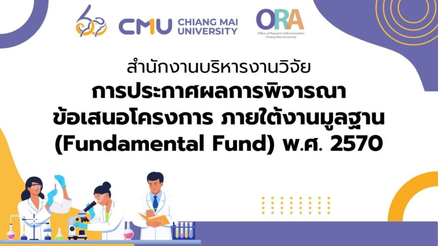 สำนักงานบริหารงานวิจัย ขอแจ้งผลการพิจารณาข้อเสนอโครงการ ภายใต้งานมูลฐาน (Fundamental Fund) ประจำปีงบประมาณ พ.ศ.2570 ซึ่งเป็นผลการพิจารณาเบื้องต้น ยังไม่ถือเป็นการสนับสนุนงบประมาณ ทั้งนี้ หัวหน้าโครงการจะต้องดำเนินการแก้ไขข้อเสนอโครงการ และปรับปรุงตามข้อเสนอแนะของผู้ทรงคุณวุฒิ โดยสำนักงานบริหารงานวิจัย จะส่งผลการพิจารณาและข้อเสนอแนะเป็นรายโครงการให้กับหัวหน้าโครงการผ่าน e-mail ของหัวหน้าโครงการ (e-mail @cmu.ac.th) โดยจะเป็นการส่งออกจาก e-mail : ff2566cmu2@gmail.com