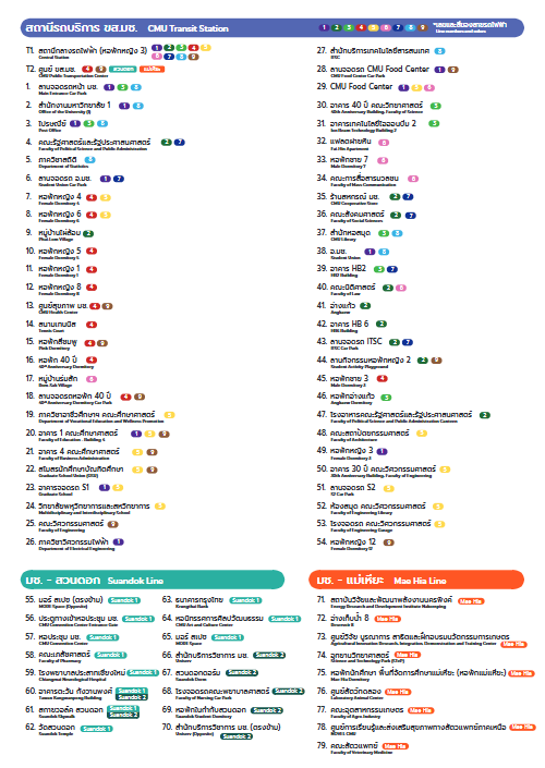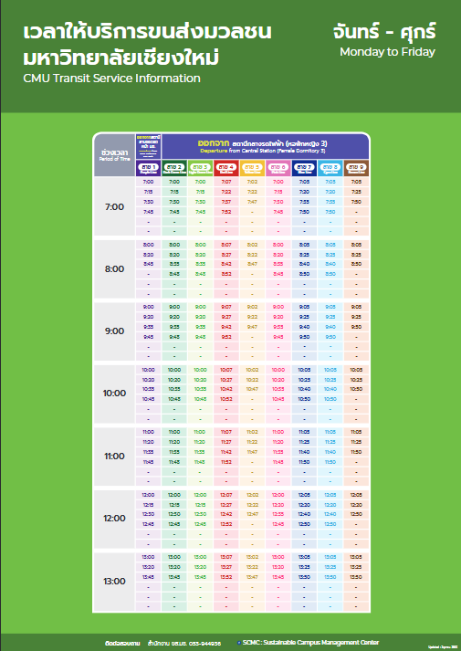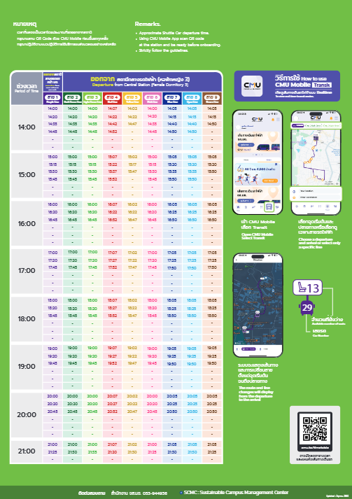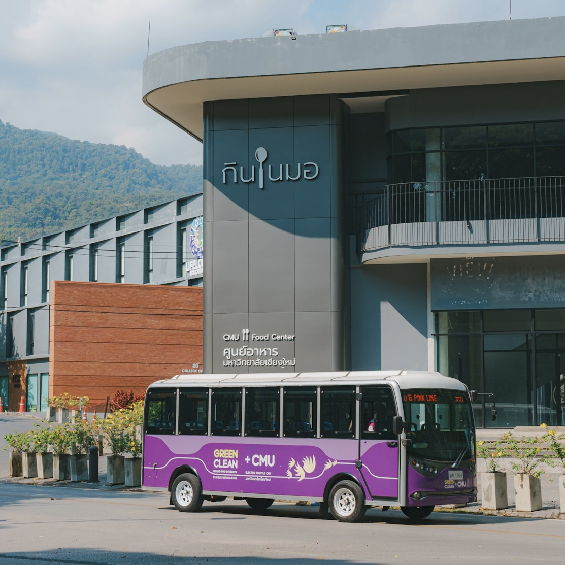 For inter-campus transportation between Mae Hia Campus (Faculty of Agro-Industry, Faculty of Veterinary Medicine, Northern Science Park) and Suan Dok Campus (Maharaj Nakorn Chiang Mai Hospital and health science faculties), the university operates 20-seat minibuses and vans. Multiple vehicles in this fleet have been converted to run on compressed biogas (CBG) produced from biomass waste collected within the university and Suthep subdistrict. This biogas is processed at the Biomass Management Center located at Mae Hia Campus, significantly reducing greenhouse gas emissions from campus transportation operations.