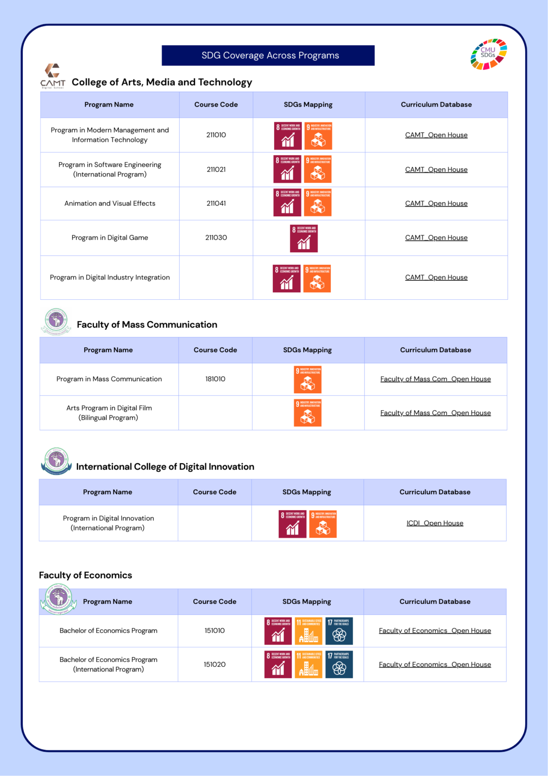 The CMU GE program establishes a foundation for all students—regardless of discipline—to develop essential competencies for sustainable citizenship. Each course is mapped to specific SDGs to ensure that global awareness, ethical thinking, and sustainable innovation are core learning outcomes. The five primary GE domains—Language Literacy, Digital Literacy, Global Citizenship, Innovation and Creativity, and Entrepreneurship—are strategically aligned with SDG 4 (Quality Education), SDG 8 (Decent Work and Economic Growth), and SDG 9 (Industry, Innovation, and Infrastructure).pol.cmu+1
