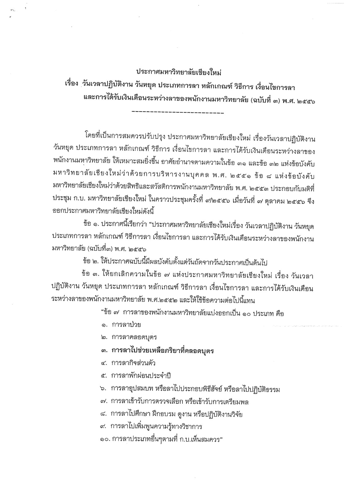 Chiang Mai University’s leave policy establishes robust support for working parents through detailed maternity and paternity provisions that promote gender equality in the workplace. These policies, established in 2009-2013 and reaffirmed through Amendment 4 in 2022, remain actively implemented today.