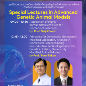 บรรยายพิเศษด้านสัตว์ทดลองและเทคโนโลยีชีวการแพทย์ 📣📣ศูนย์สัตว์ทดลอง สำนักงานบริหารงานวิจัย มหาวิทยาลัยเชียงใหม่ ร่วมกับ สถานสัตว์ทดลองเพื่องานวิจัย มหาวิทยาลัยนเรศวร 📣📣 ขอเชิญนักวิจัย คณาจารย์ นักศึกษาบัณฑิตศึกษา บุคลากรมหาวิทยาลัยเชียงใหม่ที่สนใจ ... 20 เม.ย. 08:30 - 13:00