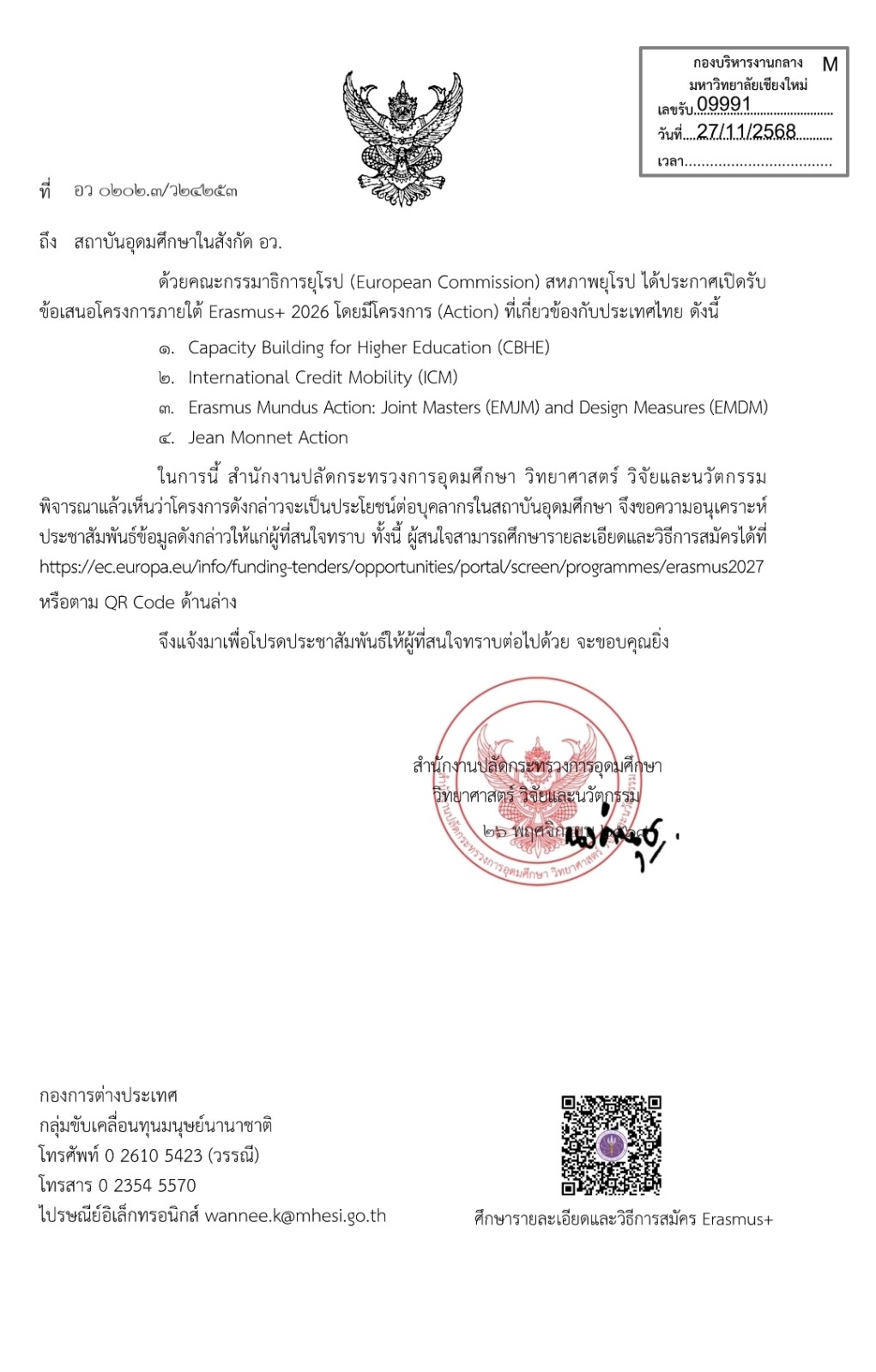 📢สำนักงานปลัดกระทรวงการอุดมศึกษา วิทยาศาสตร์ วิจัย และนวัตกรรม ประชาสัมพันธ์การเปิดรับข้อเสนอโครงการภายใต้ ERASMUS+ 2026 ได้แก่โครงการดังต่อไปนี้
