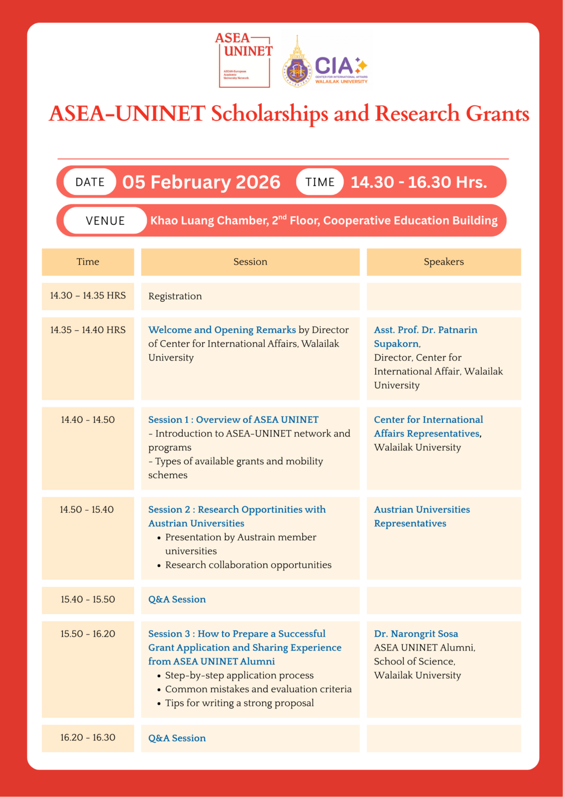 ศูนย์กิจการนานาชาติ มหาวิทยาลัยวลัยลักษณ์ เรียนเชิญคณาจารย์ นักวิจัย บุคลากรทางการศึกษา บุคคลภายนอก และผู้สนใจทั่วไป เข้าร่วมกิจกรรม Info Session: ASEA-UNINET Scholarships and Research Grants เพื่อเผยแพร่ข้อมูลเกี่ยวกับทุนการศึกษาและทุนวิจัยภายใต้เครือข่าย ASEA-UNINET ตลอดจนโอกาสความร่วมมือด้านการวิจัยและการแลกเปลี่ยนกับมหาวิทยาลัยชั้นนำในสาธารณรัฐออสเตรีย