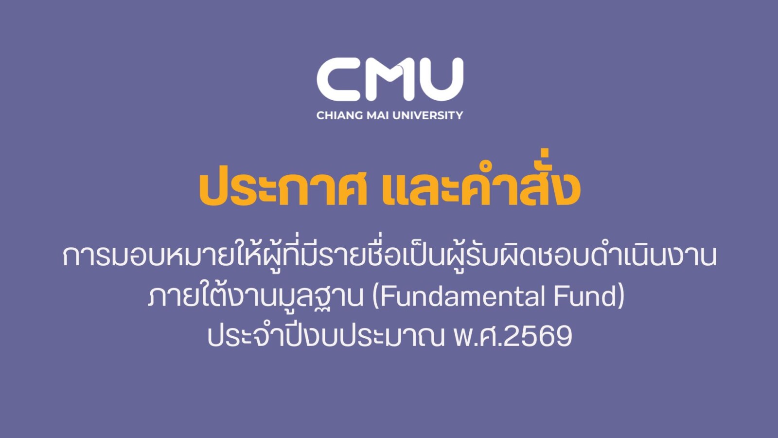 ในการนี้ เพื่อให้การดำเนินโครงการเป็นไปด้วยความเรียบร้อย จึงอาศัยอำนาจตามความในมาตรา 35 และมาตรา 38 แห่งพระราชบัญญัติมหาวิทยาลัยเชียงใหม่ พ.ศ.2551 ให้ผู้ที่มีรายชื่อเป็นผู้รับผิดชอบดำเนินงานภายใต้งานมูลฐาน (Fundamental Fund) ประจำปีงบประมาณ พ.ศ.2569 โดยให้ผู้ที่ได้รับมอบหมายต้องทำหน้าที่ในการดำเนินโครงการ และรับผิดชอบจนกว่าจะแล้วเสร็จตามระยะเวลาที่กำหนด สามารถดูรายชื่อเพิ่มเติมได้ที่เอกาสารแนบ