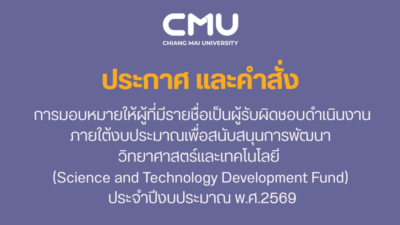 ในการนี้ เพื่อให้การดำเนินโครงการเป็นไปด้วยความเรียบร้อย จึงอาศัยอำนาจตามความในมาตรา 35 และมาตรา 38 แห่งพระราชบัญญัติมหาวิทยาลัยเชียงใหม่ พ.ศ.2551 ให้ผู้ที่มีรายชื่อเป็นผู้รับผิดชอบดำเนินงานภายใต้งบประมาณเพื่อสนับสนุนการพัฒนาวิทยาศาสตร์และเทคโนโลยี (Science and Technology Development Fund) ประจำปีงบประมาณ พ.ศ.2569 โดยให้ผู้ที่ได้รับมอบหมายต้องทำหน้าที่ในการดำเนินโครงการ และรับผิดชอบจนกว่าจะแล้วเสร็จตามระยะเวลาที่กำหนด สามารถดูรายชื่อเพิ่มเติมได้ที่เอกาสารแนบ
